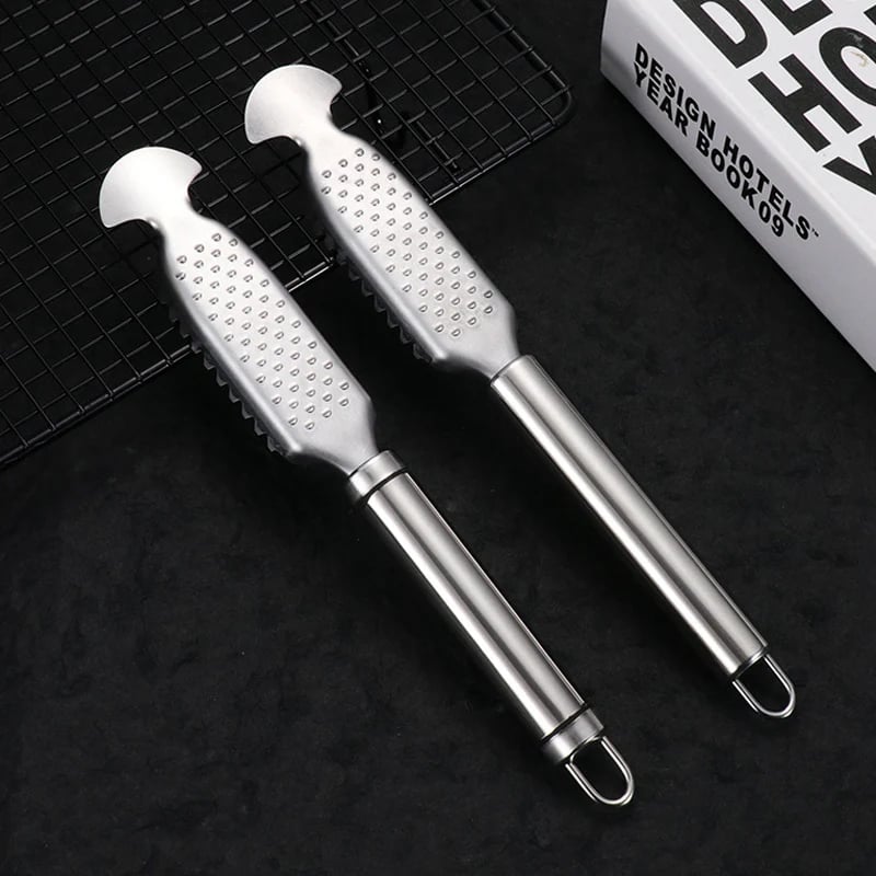 MULTI-FUNCTION CUTTING EXAMPLE: The sharp edge of this tool not only scales but also easily guts fish, streamlining the process with a single tool.
